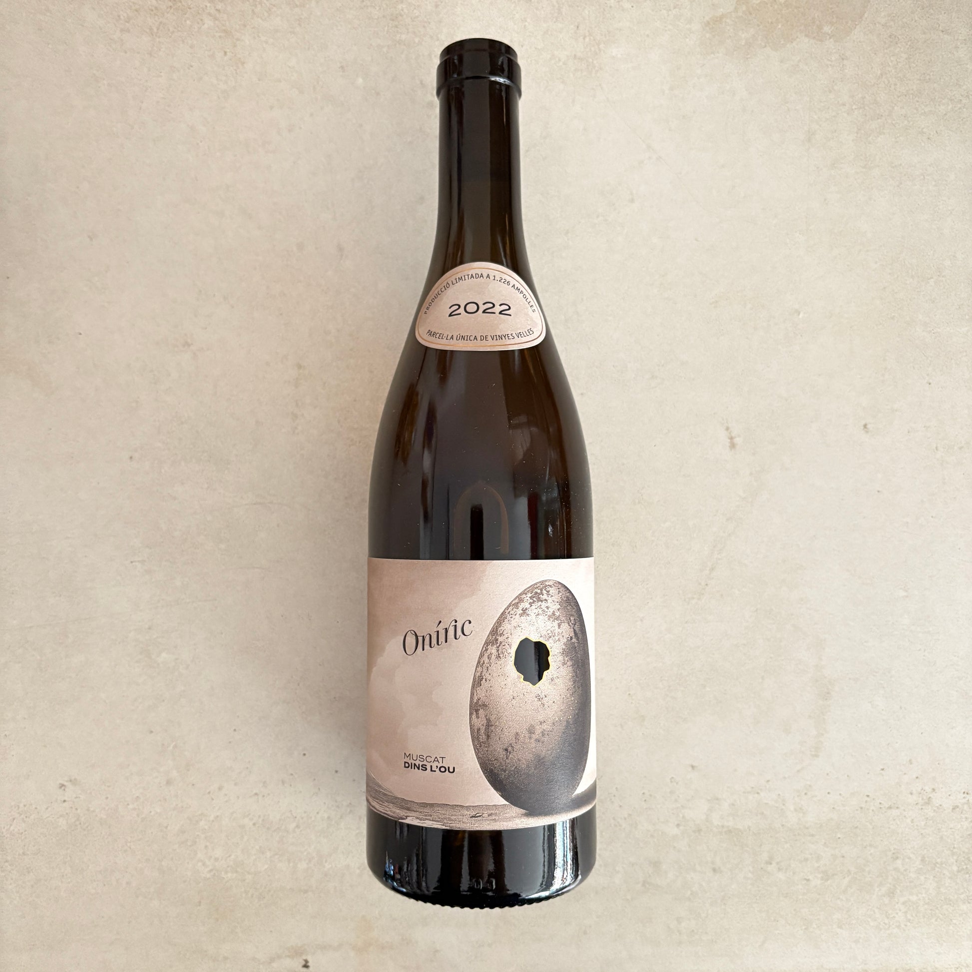 Oniric Dins L’ou 2022 is an expressive orange wine from Catalonia, made from old-vine Muscat of Alexandria aged nine months on its skins in clay eggs. It’s aromatic and textured, with notes of orange blossom, dried apricot, honey, and herbs, balanced by gentle tannins and a savory, mineral edge. Rich yet refined, it captures both the floral exuberance of Muscat and the depth of long skin contact — a beautifully dreamy, natural-style wine true to its name